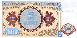 500 manats | brown, blue and orange | Portrait of Nizami Ganjavi | inscription «AZƏRBAYCAN MİLLİ BANKI» and denomination «BEŞ YÜZ manat» | 1993, 1999 | |