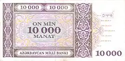 10,000 manats | 130×65 | brown | Palace of the Shirvanshahs | inscription «AZƏRBAYCAN MİLLİ BANKI» and denomination «ON MİN 10 000 manat» | 1994 |