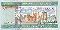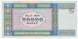 50,000 manats | 132×66 | green | Momine Khatun Mausoleum | inscription «AZƏRBAYCAN MİLLİ BANKI» and denomination «ƏLLİ MİN 50 000 manat» | 1995 |