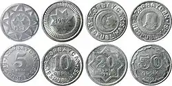 Coins were issued in denominations of 5, 10, 20, and 50 gapiks, dated 1992 and 1993. Although brass and cupronickel were used for some of the 1992 issues, later issues were all in aluminium. These coins were rarely used in circulation.