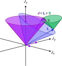 "Vector cones" of total angular momentum J (purple), orbital L (blue), and spin S (green). The cones arise due to quantum uncertainty between measuring angular momentum component.