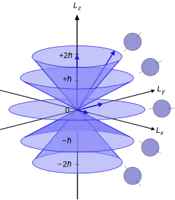 Azimuthal quantum number: Illustrating (five) alternative orbital angular momentum shapes as "cones"—here portraying (five) alternative values in terms of the reduced Planck constant, ħ.