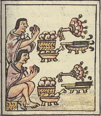 The main method of preparation was boiling or steaming in two-handled clay pots or jars called xoctli in Nahuatl and translated into Spanish as olla (pot). Ceramics were vital to the cooking process and served at least three major purposes: nixtamal preparation, tamale steaming, and cooking beans, stews, and hot beverages.[8] The xoctli was filled with food and heated over a fire. It could also be used to steam food by pouring a little water into the xoctli and then placing tamales wrapped in maize husks on a light structure of twigs in the middle of the pot.[9]
