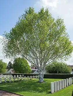 In World War I, Béthune was an important railway junction and command centre for the British Canadian Corps and Indian Expeditionary Force, as well as the 33rd Casualty Station until December 1917. It initially suffered little damage until the second phase of the Ludendorff Offensive in April 1918, when German forces reached Locon, 5 km (3 mi) away. On 21 May, a bombardment destroyed large parts of the town, killing more than 100 civilians.[9] Over 3,200 casualties are buried in Béthune Town Cemetery, the Commonwealth section of which was designed by Edwin Lutyens; the majority are British (2,933) or Canadian (55), the remainder German.[10]