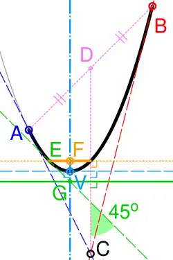 - If D is the midpoint of AB, the tangent to the curve which is perpendicular to CD (dashed cyan line) defines its vertex (V). Its axis of symmetry (dash-dot cyan) passes through V and is perpendicular to the tangent.