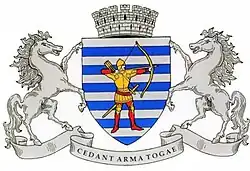 A shield, with alternating six silvery strips (symbolizing water), and six blue strips (symbolizing earth), form the background (symbolizing the name of the city). The central element of the shield is an archer in red clothes, in the military outfit (yellow) of Stephen III of Moldavia (Romanian: Ștefan cel Mare) times (15th century). The archer represents the medieval military recruitment, formed by local free peasants.[9]
