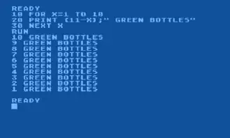 THEN, but later versions allowed any valid statement to follow.ELSEwas not widely supported, especially in earlier versions. FOR ... TO ... {STEP} ... NEXT- repeat a section of code a given number of times. A variable that acts as a counter, the "index", is available within the loop.