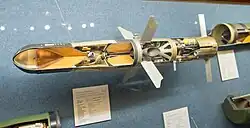 A TOW missile cutaway at a museum in Germany. The warhead is on the left, with its copper liner evident. Behind the warhead is the rocket motor with one exhaust nozzle visible. At the right is the guidance system and wire dispensers.