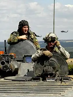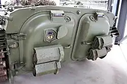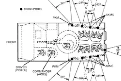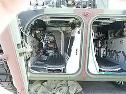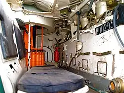The commander's station is located behind the driver's station and is provided with a removable OU-3GA2 or OU-3GK infrared searchlight with an effective range of about 400 metres (440 yd).[32] A dual mode (day/night) TKN-3B 5x/4.2x magnification binocular vision device is coupled to the infrared searchlight. Two periscope vision blocks are fitted with a heating and cleaning system.[33][34] The commander's station is equipped with an R-123M radio set.