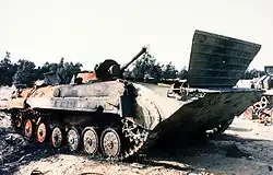 The BMP-1 is a Soviet amphibious tracked infantry fighting vehicle that has been in service from 1966 to the present. BMP stands for Boyevaya Mashina Pyekhoty 1 (Russian: Боевая Машина Пехоты 1; БМП-1), meaning "infantry fighting vehicle, 1st serial model".[13] The BMP-1 was the first mass-produced infantry fighting vehicle (IFV) of the Soviet Union.[10][14] It was called the M-1967, BMP and BMP-76PB by NATO before its correct designation was known.[15][16]