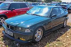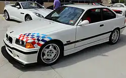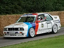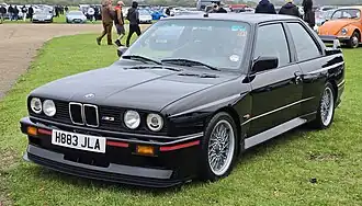 The first BMW M3 was based on the E30 3 Series and was intended to be a homologation special to satisfy the Deutsche Tourenwagen Meisterschaft and Group A Touring rules, which required a total of 5,000 of the base model to be built with a further 500 evolution specials.[4] It was presented to the public at the 1985 Frankfurt Motor Show, and began production from March 1986 to June 1991.[5][6][7] The E30 M3 was mainly produced in the coupé body style, but limited volumes of convertibles were also produced.[8]