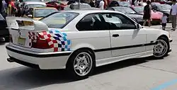 The front splitter,[9] the rear apron, sill panels, as well as changes to the body in the area of the rear window (C-pillar) and the bootlid improved the aerodynamics.[10] For aerodynamic reasons, the rear window was flattened and the tailgate was made of light, glass-reinforced plastic raised by approximately 40 mm for better air flow.[4] The changes over the rear of the car resulted in lower lift forces and better straight-line stability. In addition, the windscreen was glued in – not, as with the other E30 models, framed with a window rubber and piping. As a result, the M3 achieved a relatively low drag coefficient of Cd=0.33 instead of Cd=0.38 as in the standard 3 Series. The only exterior body panels the regular 3 Series and the M3 shared were the bonnet, roof panel, and sunroof.