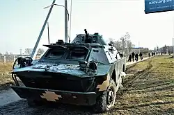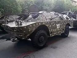 In the Russo-Ukrainian War, the BRDM-2 and several of its variants were used by both sides. On the morning of 13 June 2014, during the First Battle of Mariupol, the Azov Battalion, Dnipro-1 Battalion and the National Guard of Ukraine retook the city and key buildings occupied by insurrectionists killing five militants and destroying an insurrectionist BRDM-2 armoured vehicle. BRDM-2s also saw action during the Russian invasion of Ukraine, primarily on the Ukrainian side. As of February 5th 2025 the open source intelligence website Oryx reports 17 BRDM-2s lost on the Russian side, and 157 for the Ukrainians.[14][15]