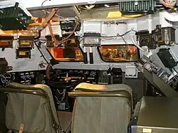 The driver's and commander's stations are in the front of the vehicle, with the driver positioned on the left and commander on the right. Both of them sit behind a bulletproof windscreen, which provides them with their primary view of the battlefield. When in combat, the windscreen can be additionally protected by twin armoured shutters. When the shutters are in their opened position, they protect the driver and commander from being blinded by the sunlight and ensure that the windscreen won't be blurred by rain or snow. The commander and driver have periscopes allowing both of them a more detailed view of the surrounding terrain. The commander has six TNP-A periscopes (five in the front and one on the side of the vehicle), a TPKU-2B day sight and a TKN-1 night sight (night-vision device). The driver has four TNP-A periscopes (all in the front), one of which can be replaced by a TWN-2B night-vision device. The gunner is in the turret during combat, but when traveling he is seated inside the hull.