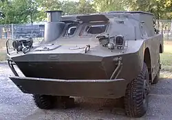 Polish BRDM-2 with the opened shutters, an IR spotlight, side TNP-A periscopes and a trim board in front.[1]