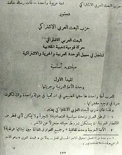 The delegates at the 6th National Congress elected an Ideology Committee that was responsible for writing a charter about the party's ideology.[73] The end result was the document Points of Departure.[73] The document, which was approved by the 6th National Congress, relegated Arab unity to a secondary role and gave socialism prominence.[73] Marxist concepts were used interchangeably alongside Ba'athist ones; however, the document was reluctant in explicitly admitting that certain ideas were of Marxist origins.[74] The 6th National Congress borrowed key Marxist-Leninist tenets such as "people's democracy" and emphasized the need of a socialist vanguard in-order to:
