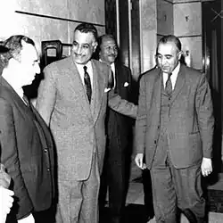 On 24 June 1959, Fuad al-Rikabi, the Regional Secretary of the Iraqi Regional Branch, accused the National Command of betraying Arab nationalist principles by conspiring against the UAR.[15] In light of these criticisms, the Ba'ath convened the 3rd National Congress, held 27 August–1 September 1959, attended by delegates from Iraq, Lebanon, Jordan, South Arabia, the Gulf, "Arab South", "Arab Maghreb", Palestine, and Party student organisations in Arab and other universities.[16] The congress is notable for endorsing the dissolution of the Syrian Regional Branch, which had been decided by Aflaq and Bitar without inner-party consultation in 1958,[17] and for expelling Rimawi, the Regional Secretary of the Jordanian Regional Branch.[18] Rimawi reacted to his expulsion by forming his own party, the Arab Socialist Revolutionary Ba'ath Party, which established a rival National Command to compete with the original.[19] The National Command responded to the problems in Iraq by appointing a Temporary Regional Command on 2 February 1960, which appointed Talib El-Shibib as Regional Secretary,[15] and on 15 June 1961 the National Command expelled Rikabi from the party.[15]