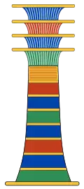 The Baʿal of Ugarit was the epithet of Hadad, but as time passed, the epithet became the god's name while Hadad became the epithet.[36] Baʿal was usually said to be the son of Dagan, but appears as one of the sons of El in Ugaritic sources.[30][22][d] Both Baʿal and El were associated with the bull in Ugaritic texts, as they symbolized both strength and fertility.[37] He held special enmity against snakes, both on their own and as representatives of Yammu (lit. "Sea"), the Canaanite sea god and river god.[38] He fought the Tannin (Tunnanu), the "Twisted Serpent" (Bṯn ʿqltn), "Lotan the Fugitive Serpent" (Ltn Bṯn Brḥ, the biblical Leviathan),[38] and the "Mighty One with Seven Heads" (Šlyṭ D.šbʿt Rašm).[39][e] Baʿal's conflict with Yammu is now generally regarded as the prototype of the vision recorded in the 7th chapter of the biblical Book of Daniel.[41] As vanquisher of the sea, the Canaanites and Phoenicians regarded Baʿal as the patron of sailors and sea-going merchants.[38] As vanquisher of Mot, the Canaanite death god, he was known as Baʿal Rāpiʾuma (Bʿl Rpu) and regarded as the leader of the Rephaim (Rpum), the ancestral spirits, particularly those of ruling dynasties.[38]