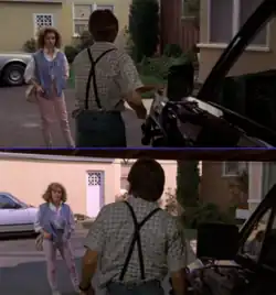 Rather than write George out of the film, Zemeckis used previously filmed footage of Glover from the first film as well as new footage of actor Jeffrey Weissman, who wore prosthetics including a false chin, nose, and cheekbones to resemble Glover. Various techniques were used to obfuscate the Weissman footage, such as placing him in the background rather than the foreground, having him wear sunglasses, and hanging him upside down. Glover would also learn from Weissman that the molds created from his face to make the aging prosthetics for 1985 George McFly in the first film were reused to make the prosthetics for Weissman's portrayal. Unhappy with this, Glover filed a lawsuit against the producers of the film on the grounds that they neither owned his likeness nor had permission to use it. As a result of the suit, there are now clauses in the Screen Actors Guild collective bargaining agreements stating that producers and actors are not allowed to use such methods to reproduce the likeness of other actors.[15] Glover's legal action, while resolved outside of the courts, has been considered as a key case in personality rights for actors with increasing use of improved special effects and digital techniques, in which actors may have agreed to appear in one part of a production but have their likenesses be used in another without their agreement.[16][17]