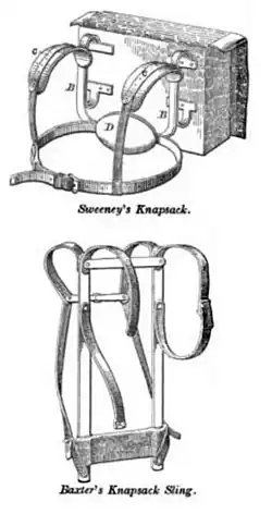 The first external frame rucksack to receive a patent was made by Henry Clay Merriam, a U.S. Army officer during the late 19th century. Introduced in 1887, Merriam's innovative pack was made with drab duck canvas, which was attached to a light steel frame. In addition to two shoulder straps, the pack featured several leather straps that allowed the infantryman to attach his bedroll and canteen to the frame, instead of having them rest on his chest and hips. The most important feature, however, was the two hardwood rods that extended from the sides of the pack to leather pockets on a half-belt, which rested across the lower back and hips. This system allowed the pack to elevate off the back and shoulders, and thus transfer the weight of the load onto the hips. Though he tried in vain to sell his invention to the U.S. Army, he was only able to sell a few thousand packs to the New York National Guard, and the French and Austrian Armies.[8]: 202–203