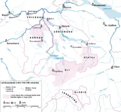 The baths were frequented again by the time of Charlemagne.[10] A medieval necropolis in Kappelerhof has been dated as far back as the 7th century and a local lord fortifying the Stein by the 10th.[6] The modern name Baden is first attested in 1040.[6] Around that time, its land was held by the Lenzburgs, some of whom styled themselves as the "Counts of Baden" in the 12th century and erected a castle.[18] Upon their extinction around 1172, their domains were divided among the Hohenstaufens, Zähringens, and Kyburgs, with the Kyburgs gaining control of Baden through the marriage of Harmanns III with its heiress Richenza.[19] Around 1230, they founded the medieval city of Baden,[19] holding markets and erecting a bridge across the river in 1242.[6] Upon the death of the childless Hartman IV in 1264, his lands were seized by Rudolf von Habsburg by right of his wife Gertrude's claim. Stein Castle was held by Habsburg bailiffs and maintained the administration and archives for their surrounding territory.[6] The Confederacy besieged and destroyed the castle and its records in 1415 during its conquest of Aargau.[6] Thus, the County of Baden was established.