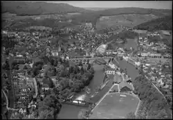 Downtown Baden is located on the left bank of the river Limmat in its eponymous valley.[5] Its area is divided into the Kappelerhof, Allmend, Meierhof, and Chrüzliberg. In 1962, Baden also absorbed the adjacent village of Dättwil. On the right bank of the river is the village of Ennetbaden, formerly "Little Baden" (Kleine Bäder).[6]