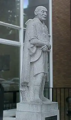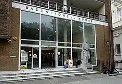 A nearly three metre–high statue of Baden-Powell, sculpted by his friend Don Potter, was unveiled on 12 July 1961 by the Duke of Gloucester as part of the official opening of Baden-Powell House.[4] It was located outside the main entrance for the duration the Scout Association's ownership of the building, and was moved in August 2021 to Gilwell Park.[27]