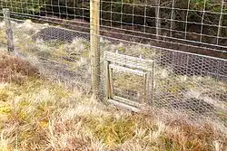 When protecting woodlands from deer and rabbit, installing fences in badger territory can be problematic. Because badgers are persistent and strong, if fences are placed across their "runs"—established foraging and travel paths—they may well dig through or under, damaging the fence and leaving openings that rabbits can get through. Ideally, badger runs should be identified before fence construction begins. The gateways are constructed in stages over time to ensure that badgers are using the manmade openings instead of damaging the new fence: starting with leaving a cut opening in the fence at ground level, later laying a floor (threshold), later still framing the opening, and eventually hanging a small free-swinging door that is heavy enough that rabbits don't seem to learn how to push them open. The recommended door size is 18 by 25 cm and weighs about 1.1 kg.[39][40]