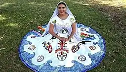 Flor de Cucapá: Flor de Cucapá is the traditional attire of Baja California, created in 1954 as a symbol of cultural and regional identity for one of Mexico's youngest states. This iconic outfit was designed by María de la Cruz Pulido following a state-wide contest organized by the government to represent Baja California's rich natural and cultural heritage. Inspired by the region's diversity, the attire consists of five pieces made of white cotton fabric, each imbued with symbolic meaning. The circular skirt features embroidered details of cacti and marine elements, representing the deserts and the Sea of Cortés.[23] The blouse includes an embroidered depiction of a woman with open arms, symbolizing the warmth and hospitality of the people of Baja California.[24]