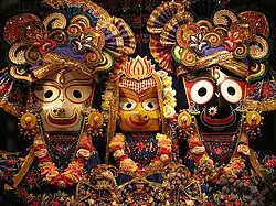 In the Jagannath tradition, one particularly popular in eastern and central regions of India, he is more often called Balabhadra. Balarama is one in the triad, wherein Balarama is shown together with his brother Jagannath (Krishna) and sister Subhadra (Subhadra). Jagannath is identifiable from his circular eyes compared to an oval of Shubhadra and almond-shaped eyes of the abstract icon for Balarama. Further, Balarama's face is white, Jagannath's icon is dark, and Subhadra icon is yellow. The third difference is the flat head of Jagannath icon, compared to the semi-circular carved head of abstract Balarama.[59] The shape of Balabhadra's head, also called Balarama or Baladeva in these regions, varies in some temples between somewhat flat and semi-circular.[59][60]