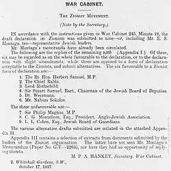 - 25 October 1917: "... the Secretary mentioned that he was being pressed by the Foreign Office to bring forward the question of Zionism, an early settlement of which was regarded as of great importance."[146]