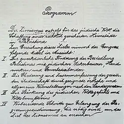 In 1896, Theodor Herzl, a Jewish journalist living in Austria-Hungary, published the foundational text of political Zionism, Der Judenstaat ("The Jews' State" or "The State of the Jews"), in which he asserted that the only solution to the "Jewish Question" in Europe, including growing anti-Semitism, was the establishment of a state for the Jews.[19][20] A year later, Herzl founded the Zionist Organization, which at its first congress called for the establishment of "a home for the Jewish people in Palestine secured under public law". Proposed measures to attain that goal included the promotion of Jewish settlement there, the organisation of Jews in the diaspora, the strengthening of Jewish feeling and consciousness, and preparatory steps to attain necessary governmental grants.[20] Herzl died in 1904, 44 years before the establishment of State of Israel, the Jewish state that he proposed, without having gained the political standing required to carry out his agenda.[10]