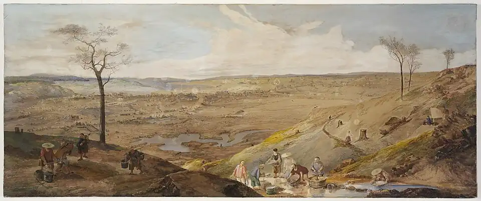 The first publicised discovery of gold in the region was by Thomas Hiscock on 2 August 1851, in Buninyong to the south.[15] The find brought other prospectors to the area and on 19 August 1851, more gold was found at Poverty Point.[16] Within days, a gold rush began, bringing thousands of prospectors to the Yarrowee Valley, which became known as the Ballarat diggings. Yields were particularly high, with the first prospectors in the area extracting between half an ounce[17] (which was more than the average wage of the time) and up to five ounces of alluvial gold per day. As news of the Victorian gold rush reached the world, Ballarat gained an international reputation as a particularly rich goldfield. As a result, a huge influx of immigrants occurred, including many from Ireland and China, gathering in a collection of prospecting shanty towns around the creeks and hills. Within a few months, numerous alluvial runs were established, several deep mining leads began, and the population had swelled to over 1,000 people.[18]