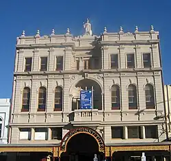 The legacy of the wealth generated during Ballarat's gold boom is still visible in a large number of fine stone buildings in and around the city, especially in the Lydiard Street area. This precinct contains some of Victoria's finest examples of Victorian era buildings, many of which are on the Victorian Heritage Register or classified by the National Trust of Australia. Notable civic buildings include the Town Hall (1870–72), the former Post Office (1864), the Ballarat Fine Art Gallery (1887), the Mechanics' Institute (1860, 1869), the Queen Victoria Wards of the Ballarat Base Hospital (1890s) and the Ballarat railway station (1862, 1877, 1888). Other historic buildings include the Provincial Hotel (1909), Reid's Coffee Palace (1886), Craig's Royal Hotel (1862–1890) and Her Majesty's Theatre (1875), the oldest intact and operating lyric theatre in Australia[59] and Ballarat Fire Station (1864, 1911) one of Victoria's oldest fire fighting structures[70] and the Jewish synagogue (1861) the oldest surviving synagogue on the Australian mainland.[71]