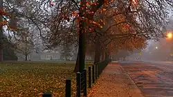 The city has a reputation for unpredictable and extreme weather, ranging from snowfall to intense heatwaves.[83] Perhaps the most infamous feature of Ballarat's climate is the chilly winter, often accentuated by driving winds.[84] In 2023, a journalist for ABC Ballarat wrote that Ballarat "is notorious for its frosty winters and the near year-round puffer jacket uniform of its residents". When measured by mean temperatures, Ballarat is the coldest city in Victoria.[85]