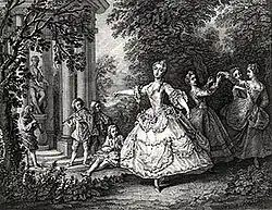 European ballet was centered in the Paris Opera.[44] During this era, skirts were raised a few inches off the ground. Flowers, flounces, ribbons, and lace emphasized this opulent feminine style, as soft pastel tones in citron, peach, pink, and pistachio dominated the color range.[44]