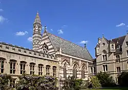 The college's dining hall was built in 1877, replacing an older hall in the front quadrangle, which had become too small for the college's population.[33] Designed by Alfred Waterhouse,[34] the hall is built in geometric style, using Bath stone and Tisbury stone, with roof and woodwork made of oak.[33] The hall features a Willis organ, instituted by Benjamin Jowett.[35] The old hall became part of the library.[36]