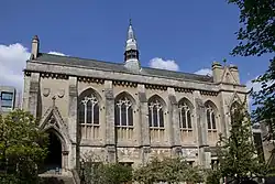 William Grey, Bishop of Ely, was a benefactor of the college in the 15th century. Grey devoted much care to the collection of manuscripts, and wherever he lived constantly employed scribes to make copies of books he could not otherwise obtain. Many of these he had adorned with costly miniatures and initial letters by the skill of an artist who worked for him at Florence. It was his desire to make his collection the nucleus of a library for Balliol College, to the building of which, as well as to that of the master's lodgings and of the old buttery and hall, he contributed largely. The work was finished about 1477 by Robert Abdy, then master of the college, and enriched with some two hundred manuscripts, the bishop's gift. Of these, many were destroyed in the reign of Edward VI and during the great rebellion, and by Wood's time few of the miniatures in the remaining volumes had escaped mutilation. But by 1890, no less than 152 of Grey's codices were still in the possession of the college, and form a large part of Roger Mynors's 1963 catalogue of the college's manuscripts.[30] The bishop's coat of arms (gules, a lion rampant, within a bordure engrailed argent) is displayed on two windows of the Old Library, and in the panels below the window of the Master's dining room. The chapel is the third (perhaps fourth) on the site and was designed by William Butterfield in 1857.