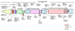The boost phase is the powered flight portion, beginning with the ignition of the engines and concluding with the end of powered flight. The powered flight portion can last from a few tenths of seconds to several minutes and can consist of multiple rocket stages.[13] Internal computers keep the missile aligned on a preprogrammed trajectory.[12] On multi-stage missiles, stage separation (excluding any post-boost vehicles or MIRV bus) occurs primarily during the boost phase.
