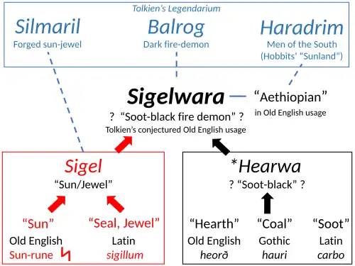 Tolkien was a professional philologist, a scholar of comparative and historical linguistics.[T 44] The Balrog and other concepts in his writings derived from the Old English word Sigelwara, used in texts such as the Codex Junius to mean "Aethiopian".[6][7] He wondered why the Anglo-Saxons would have had a word with this meaning, conjecturing that it had formerly had a different meaning. He emended the word to Sigelhearwan, and in his essay "Sigelwara Land",[T 43] explored in detail the two parts of the word. He stated that Sigel meant "both sun and jewel", the former as it was the name of the Sun rune *sowilō (ᛋ), the latter connotation from Latin sigillum, a seal.[5] He decided that Hearwa was related to Old English heorð, "hearth", and ultimately to Latin carbo, "soot". He suggested from all this that Sigelhearwan implied "rather the sons of Muspell than of Ham",[b] a class of demons in Northern mythology "with red-hot eyes that emitted sparks and faces black as soot".[T 43] The Tolkien scholar Tom Shippey states that this both "helped to naturalise the Balrog" and contributed to the Silmarils, which combined the nature of the sun and jewels.[8] The Aethiopians suggested to Tolkien the Haradrim, a dark southern race of men.[T 45][9]