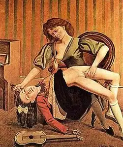 Many of his paintings show young girls in an erotic context. Balthus insisted that his work was not erotic but that it recognized the discomforting facts of children's sexuality. In 2013, Balthus's paintings of adolescent girls were described by Roberta Smith in The New York Times as both "alluring and disturbing".[19] In its transgressive themes and treatment of sexual taboo, his art has been compared to the work of the contemporary philosopher Georges Bataille (a friend of his brother Pierre Klossowski).[20][21]