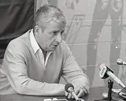 By May 1994, Baltimore Orioles owner Peter Angelos had gathered a new group of investors, including author Tom Clancy, to bid on teams whose owners had expressed interest in moving.[24] Angelos found a potential partner in Georgia Frontiere, who was open to moving the Los Angeles Rams to Baltimore. Jack Kent Cooke opposed the move, intending to build the Redskins' new stadium in Laurel, Maryland, close enough to Baltimore to cool outside interest in bringing in a new franchise.[25] This led to heated arguments between Cooke and Angelos, who accused Cooke of being a "carpetbagger".[24] The league eventually persuaded Rams team president John Shaw to move to St. Louis instead, leading to a leaguewide rumor that Tagliabue was again steering interest away from Baltimore, a claim that Tagliabue denied.[26] In response to anger in Baltimore, including Governor Schaefer's threat to announce over the loudspeakers Tagliabue's exact location in Camden Yards any time he attended a Baltimore Orioles game,[27] Tagliabue said of Baltimore's financial package, "Maybe [Baltimore] can open another museum with that money."[21] After that, Angelos made an unsuccessful $200 million bid to bring the Tampa Bay Buccaneers to Baltimore.[28]
