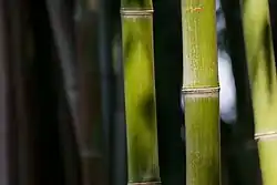 Bamboos are a diverse group of mostly evergreen perennial flowering plants making up the subfamily Bambusoideae of the grass family Poaceae.[3][4][5] Giant bamboos are the largest members of the grass family, in the case of Dendrocalamus sinicus having individual stalks (culms) reaching a length of 46 meters (151 ft), up to 36 centimeters (14 in) in diameter and a weight of up to 450 kilograms (1,000 lb).[6] The internodes of bamboos can also be of great length. Kinabaluchloa wrayi has internodes up to 2.5 meters (8 ft) in length.[7] and Arthrostylidium schomburgkii has internodes up to 5 meters (16 ft) in length,[8] exceeded in length only by papyrus. By contrast, the stalks of the tiny bamboo Raddiella vanessiae of the savannas of French Guiana measure only 10–20 millimeters (0.4–0.8 in) in length by about 2 millimeters (0.08 in) in width.[9] The origin of the word "bamboo" is uncertain, but it most likely comes from the Dutch or Portuguese language, which originally borrowed it from Malay.[5][10][11]