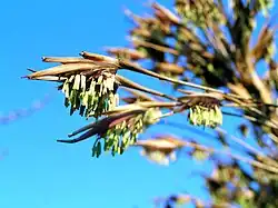 Bamboos seldom and unpredictably flower and the frequency of flowering varies greatly from species to species. Once flowering takes place, a plant declines and often dies entirely. In fact, many species only flower at intervals as long as 65 or 120 years. These taxa exhibit mass flowering (or gregarious flowering), with all plants in a particular 'cohort' flowering over a several-year period. Any plant derived through clonal propagation from this cohort will also flower regardless of whether it has been planted in a different location. The longest mass flowering interval known is 120 years, and it is for the species Phyllostachys bambusoides (Sieb. & Zucc.).[41] In this species, all plants of the same stock flower at the same time, regardless of differences in geographic locations or climatic conditions, and then the bamboo dies.[42] The commercially important bamboo Guadua, or Cana brava (Guadua angustifolia) bloomed for the first time in recorded history in 1971, suggesting a blooming interval well in excess of 130 years. The lack of environmental impact on the time of flowering indicates the presence of some sort of "alarm clock" in each cell of the plant which signals the diversion of all energy to flower production and the cessation of vegetative growth.[43] This mechanism, as well as the evolutionary cause behind it, is still largely a mystery.