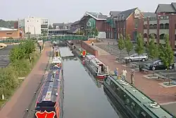 The opening of the Oxford Canal from Hawkesbury Junction to Banbury on 30 March 1778 gave the town a cheap and reliable supply of Warwickshire coal.[16] In 1787 the Oxford Canal was extended southwards,[17] finally opening to Oxford on 1 January 1790.[18] The canal's main boat yard was the original outlay of today's Tooley's Boatyard.[19] The railway reached Banbury in 1850; Merton Street station on the Buckinghamshire Railway to Bletchley opened in May 1850, followed by Bridge Street station, later renamed Banbury General, on the Great Western Railway in September 1850.[20]