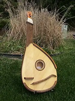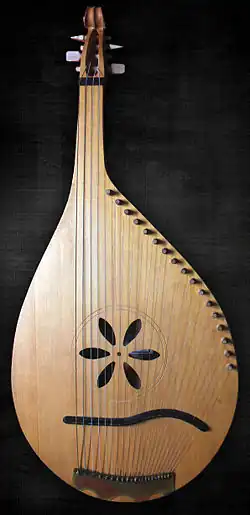 A bandura (Ukrainian: бандура [bɐnˈdurɐ] ⓘ) is a Ukrainian plucked-string folk-instrument. It combines elements of the zither and lute and, up until the 1940s, was also often called a kobza. Early instruments (c. 1700) had 5 to 12 strings and resembled lutes. In the 20th century, the number of strings increased initially to 31 strings (1926), then to 56 strings – 68 strings on modern "concert" instruments (1954).[2]