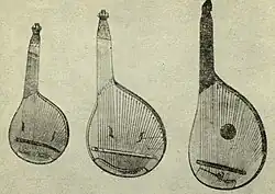 Musicians who play the bandura are referred to as bandurists. In the 19th and early 20th centuries traditional bandura players, often blind, were called kobzars.[3] It is suggested that the instrument developed as a hybrid of gusli (Eastern-European psaltery) and kobza (Eastern-European lute). Some also consider the kobza as a type or an instrument resembling the bandura.[4] The term bandura occurs in Polish chronicles from 1441. The hybridization, however, occurred in the late-18th or early-19th centuries.