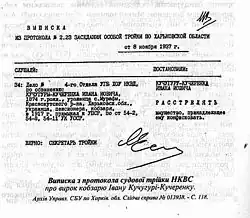 According to a widespread version, the musicians were gathered under the guise of an ethnographic conference and then mass-executed. Various versions give different times for the conference and location. The confusion is exacerbated by the fact that little differentiation is made between the kobzari, bandurists and lirnyky. Archival documents attesting to the organisation of such a conference have been found which were affirmed by bandurist Mykhailo Polotay who had been one of the instigators and organisers of the conference. Although no documents directly attesting to the mass-execution of the kobzari has been found to date, we do have a significant list of kobzari and bandurists who died or disappeared at this time.