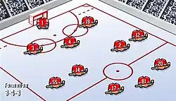 Any number of players may be replaced by substitutes during the course of the game. Substitutions can be performed without notifying the referee and can be performed while the ball is in play. However, the substitute must leave the ice before the teammate enters it. A team can bring at the most four substitutes to the game, five if one of these is an extra goalkeeper.[3]
