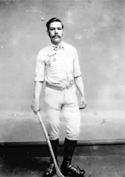 An early maker of bandy sticks was the firm of Gray's, Cambridge. One such stick, now in the collections of the Museum of Cambridge, has a length of rope twisted round the handle to rescue any player who might fall through the ice, as the game was played on frozen lakes back then. An 1899 photo of two players demonstrating the game shows the sticks being held single-handed.[19]
